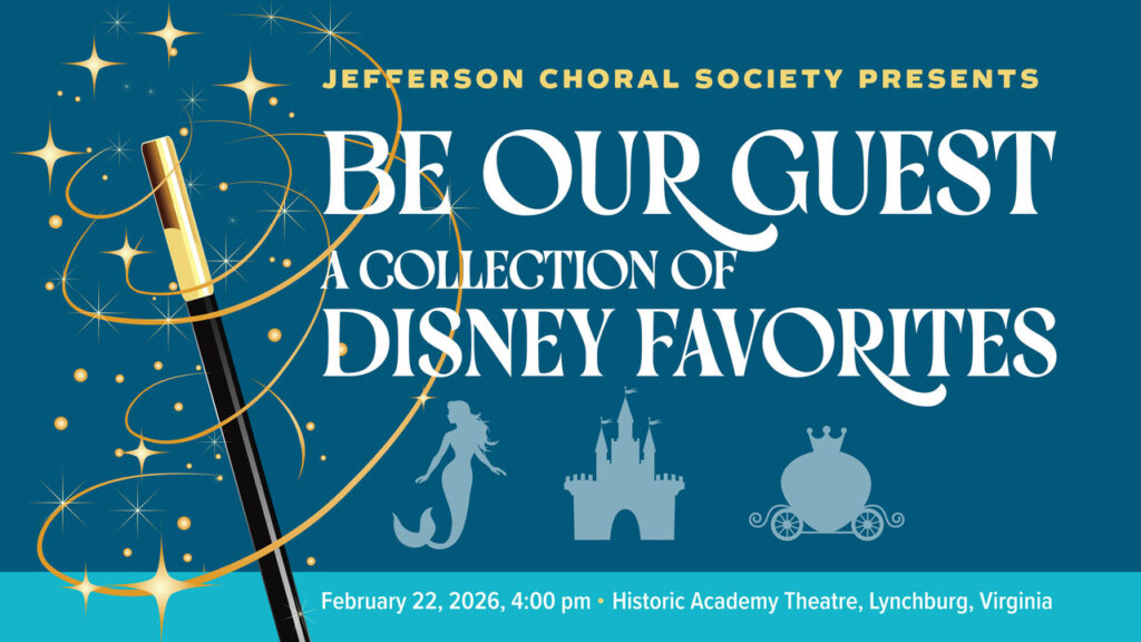 Join the Jefferson Choral Society in a musical journey through 90 years of America’s favorite family film studio! Enjoy favorites of the classic era such as “When You Wish Upon a Star” and “Zip-a-Dee Doo-Dah”; 1960s hits such as “The Bare Necessities” and “Supercalifragilisticexpialidocious”; award-nominated Renaissance-era songs such as “Circle of Life” and “A Whole New World”; and new-millennium future standards including “Let It Go” and “Waiting on a Wish.”