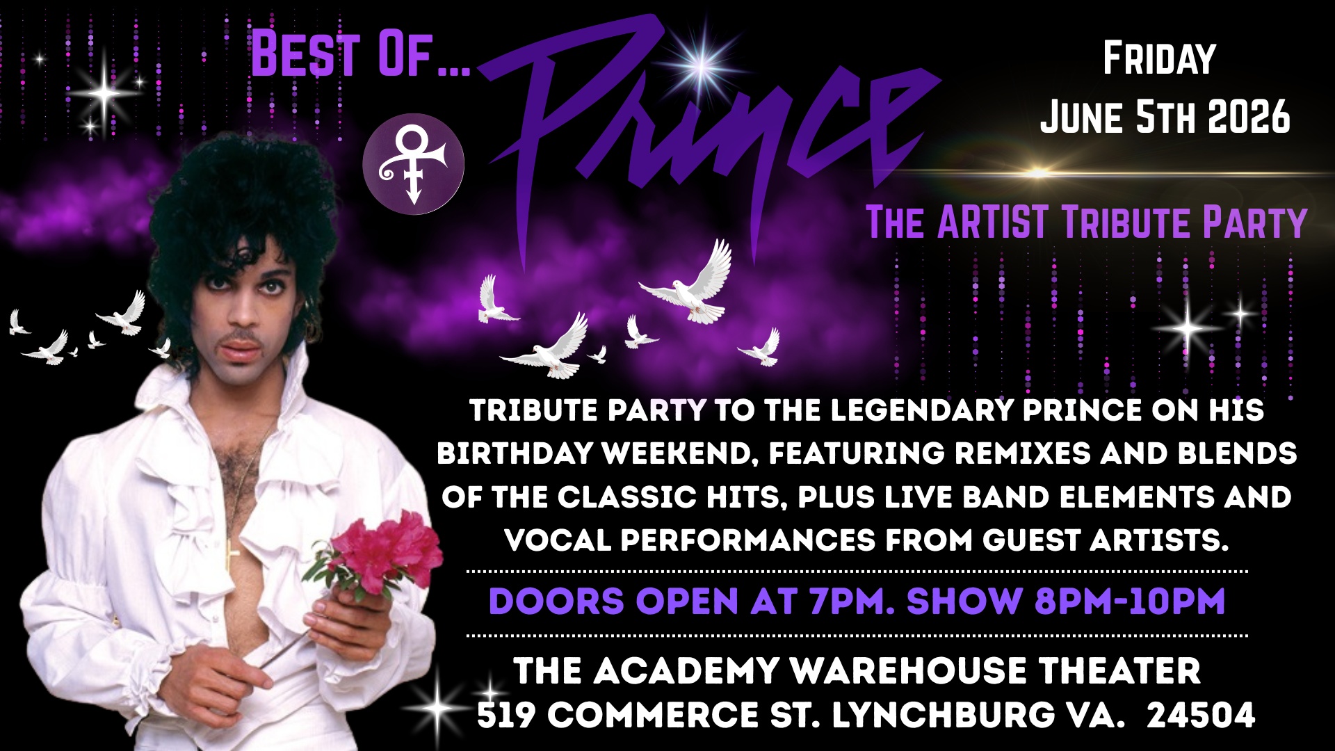 Best of Prince The Artist Tribute Party Featured June 5 @ 8:00 pm - 10:00 pm Joy & Lynch Christian Warehouse Theatre , United States $20 – $30